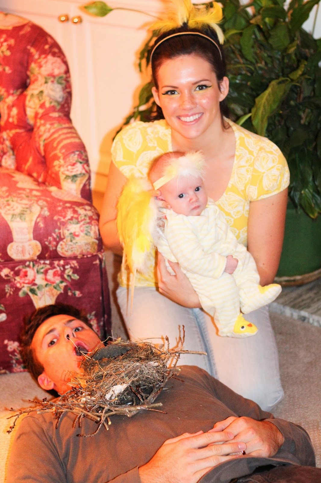 Millie has always been a little birdie. Everyone that sees her starts to call her “Birdie” or “Little Bird” without even hearing us say it. It’s because she almost always has her mouth open like a hungry baby bird and has skinny long little bird legs. So naturally - this nickname inspired her halloween costume that I made for her.